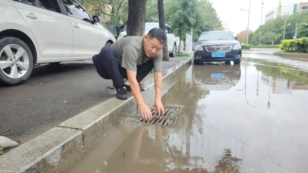 下了幾乎一夜的雨將254路車隊門前道路幾乎淹沒,254路車隊長劉佳寧拿起鐵鍬等工具,對下水道附近的污垢進行清理,排除積水。