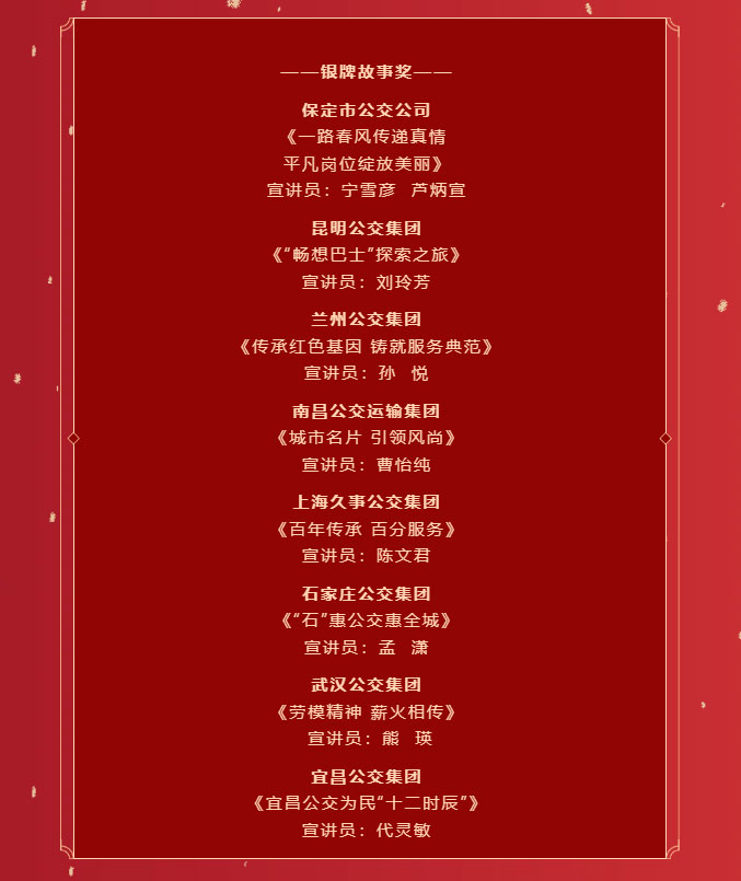 經(jīng)過專業(yè)老師、現(xiàn)場評委評審打分,城市公交政研會審核決定:深圳、北京、廣州等6地公交企業(yè)宣講作品榮獲金牌故事獎;武漢、宜昌、石家莊等8地公交企業(yè)宣講作品榮獲銀牌故事獎;合肥、貴陽、沈陽等10地公交企業(yè)宣講作品榮獲優(yōu)秀故事獎。